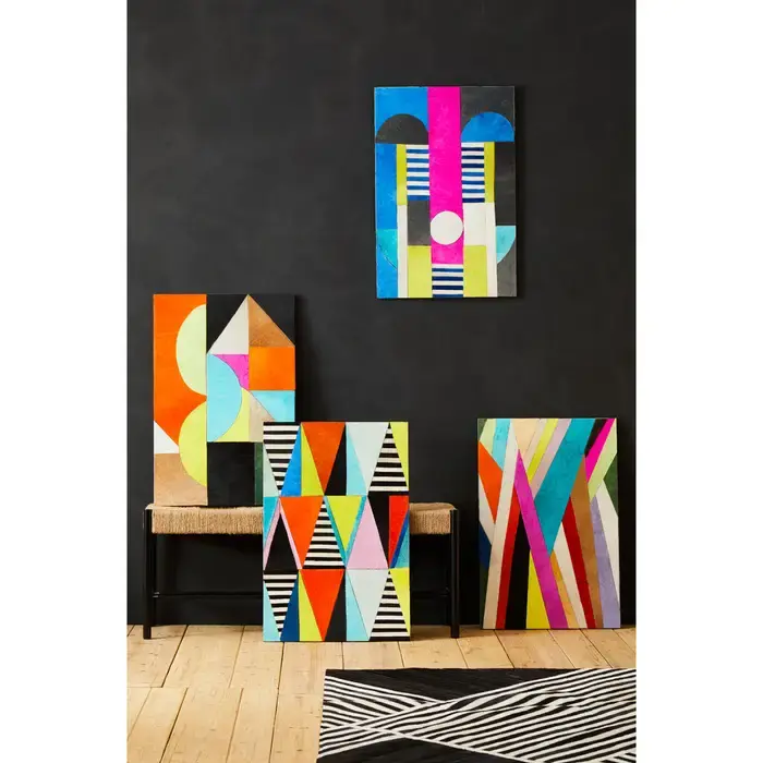 Featuring genuine cowhide leather patchwork, this wall art has a series of cutout triangular patchwork in multicoloured shades. A mix of colours, soft texture and the symmetrical pattern will create visual interest in the living room.