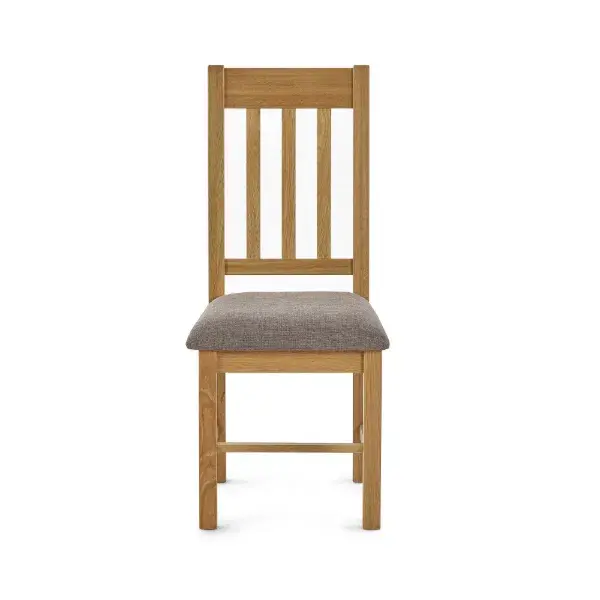 The Mallory Dining Chair features a slatted back that is angled for support allowing for comfort and durability. Crafted from solid oak and oak veneers with a grey seat pad, this dining chair combines a simple and stylish design.