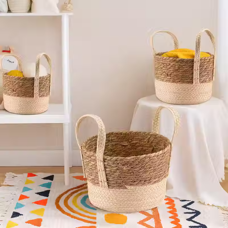 Description: Heavy-Duty & Sturdy Construction Woven Basket Reinforced double-layer weaving withstands 15+ lbs daily loads. The rigid structure maintains shape during room-to-room moves, perfect for laundry hauling or bulky item storage without sagging or deformation. Baskets Transform clutter into curated spaces: living room blanket bins, bedroom pillow hampers & bathroom towel holders. Neutral grey woven design blends seamlessly into Nordic, farmhouse, or modern interiors. Engineer-Grade Handle System Blanket Basket Thick cotton-rope handles with triple-stitch reinforcement ensure comfortable carrying even when fully loaded. Ergonomic 8-inch prevents knuckle scraping during transport. Transform your home with the Natural Straw Woven Plant Storage Basket. Its multifunctional design allows you to use it in various ways, from a toy basket for the kids' room to a laundry hamper in the bathroom. With its practical features and stylish appeal, this basket is an indispensable part of any modern home looking to improve organization and aesthetics. Specifications: Color: brown Package Included: 3*woven basket