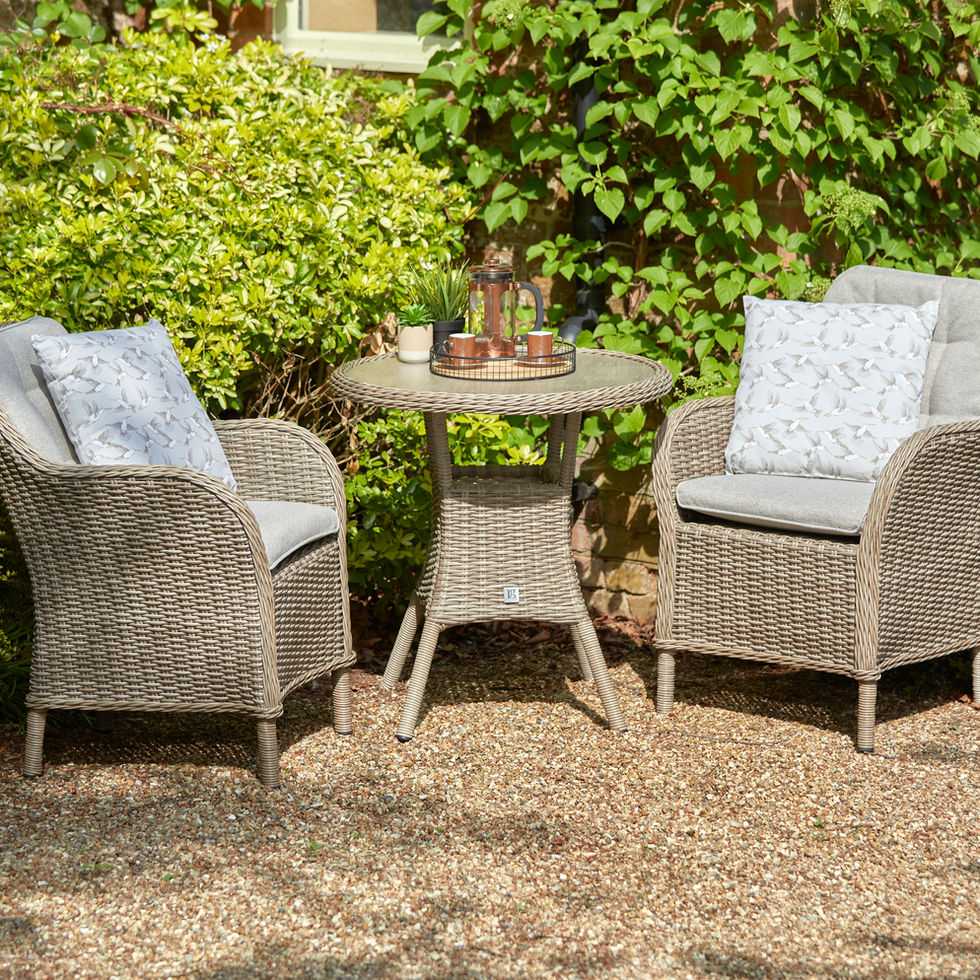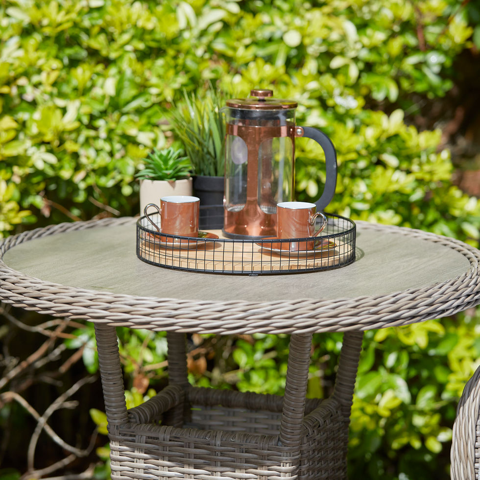 The St Tropez Sand two-seat set includes two comfortable chairs and a matching table. Designed with elegant rod-weave detailing and a sleek tabletop, it blends style with practicality for patios, balconies, or gardens.